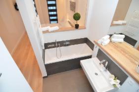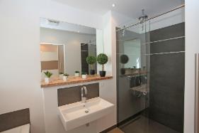 Ganz bequem gelangt man von den Schlafzimmern in das jeweils dazu gehörige Badezimmer. Beide modernen Duschbäder sind barrierefrei; Eines ist zusätzlich mit einer Badewanne ausgestattet.